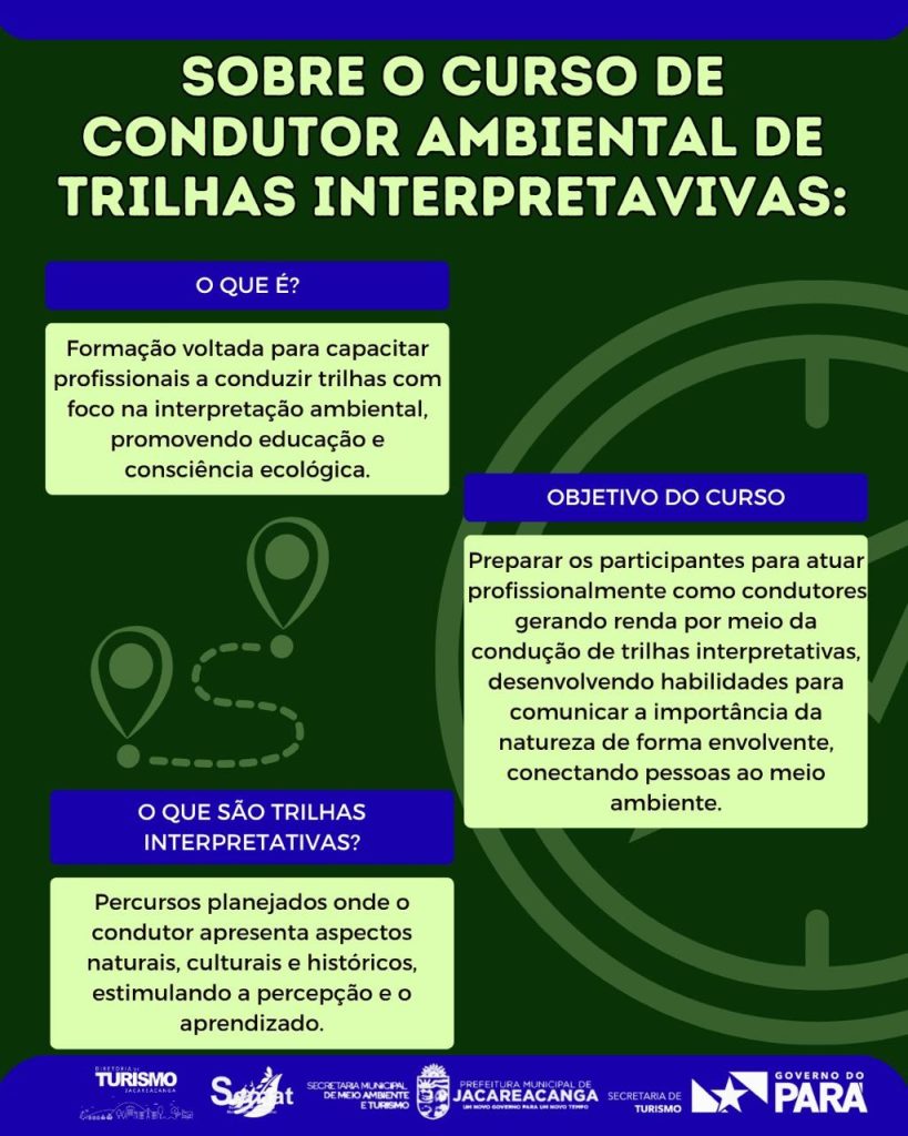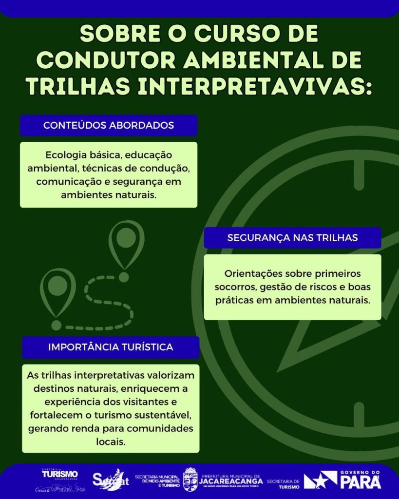 A Prefeitura de Jacareacanga, por meio da sua Diretoria de Turismo, está com inscrições abertas para o Curso de Condutor Ambiental de Trilhas Interpretativas, uma iniciativa que visa capacitar moradores para atuação no ecoturismo e na valorização ambiental do município. As inscrições seguem de 07 a 22 de abril, das 8h às 13h, na sede da Secretaria Municipal de Meio Ambiente e Turismo (SEMAT).