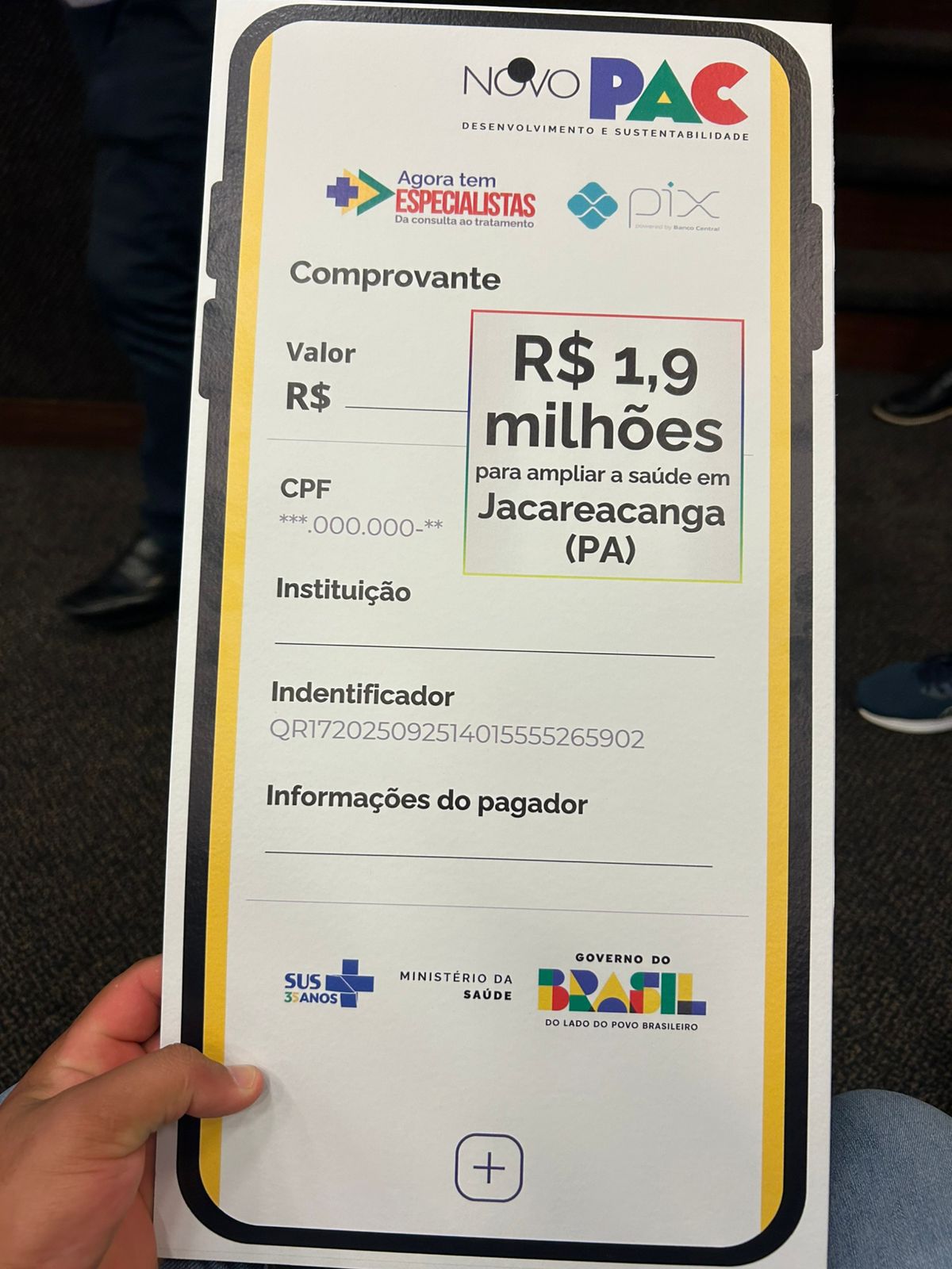 Durante a cerimônia, também foi destacado que Jacareacanga foi contemplada no Novo PAC, dentro do eixo de Desenvolvimento e Sustentabilidade, com investimento de aproximadamente R$ 1,9 milhão, destinado à ampliação dos serviços de saúde, incluindo atendimentos especializados, consultas e melhorias na estrutura de atendimento à população.